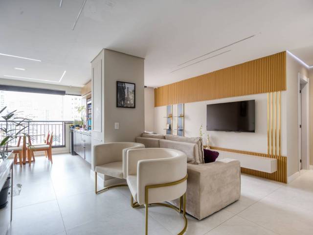 Cada detalhe deste imóvel foi pensado para oferecer o máximo de conforto, começando pelo living integrado, onde o projeto de iluminação em perfis de LED e o elegante painel ripado em madeira criam uma atmosfera acolhedora e moderna. A sala de jantar, ampliada visualmente por uma parede espelhada, conecta-se harmoniosamente à varanda. Este terraço, já fechado com envidraçamento e equipado com persianas rolô e tela de proteção, oferece uma vista urbana livre e um cantinho especial configurado como "coffee bar", ideal para relaxar no fim do dia.